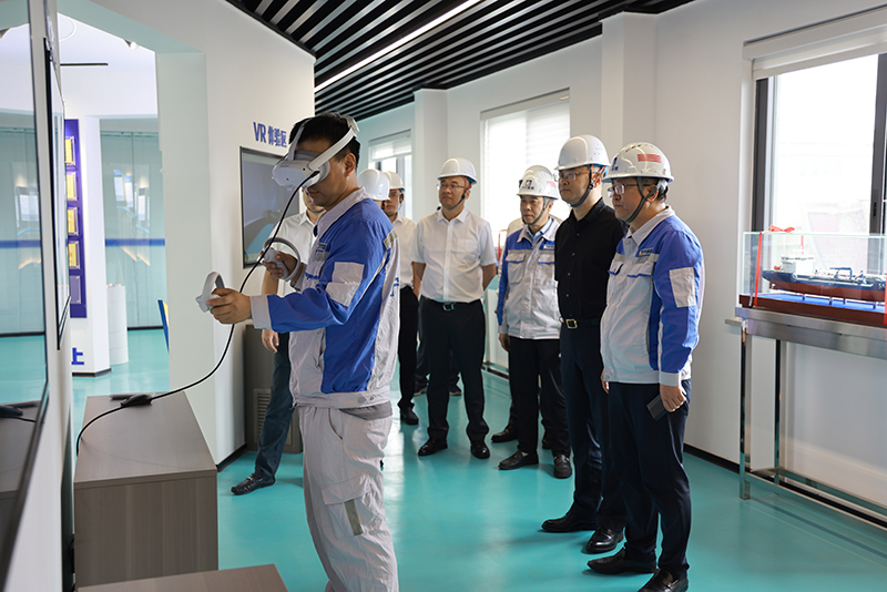 鄭浩一行參觀了VR體驗中心、船舶修造現場,感受寧興船舶數字化轉型升級的成效,并圍繞高附加值船舶修造、船舶智能制造配套中心等方面展開深入交流。此次考察增進了彼此的了解,為雙方后續在特種鋼材供應、零部件配套等領域合作提供實踐參考,進一步挖掘合作共贏的發展空間。